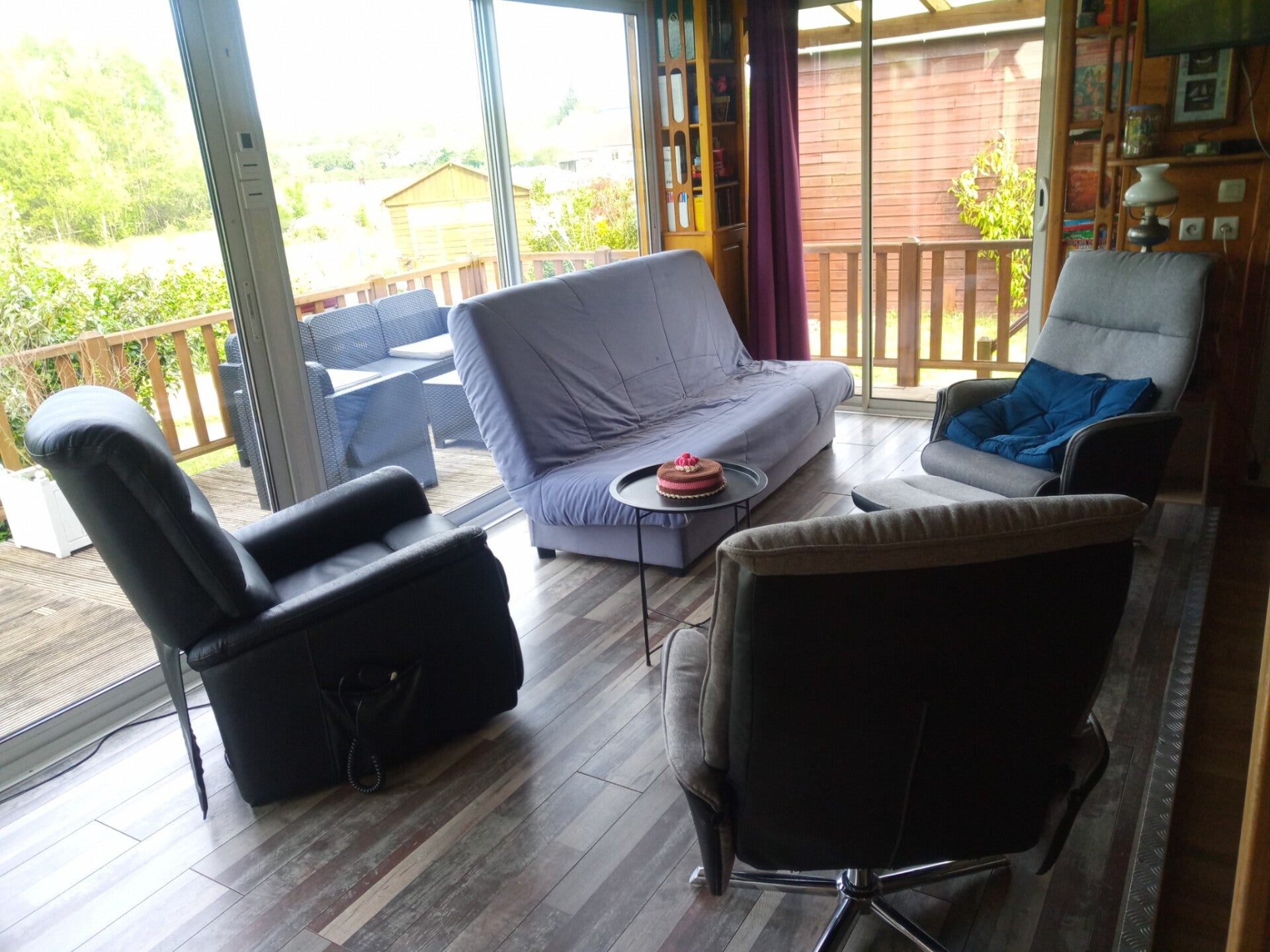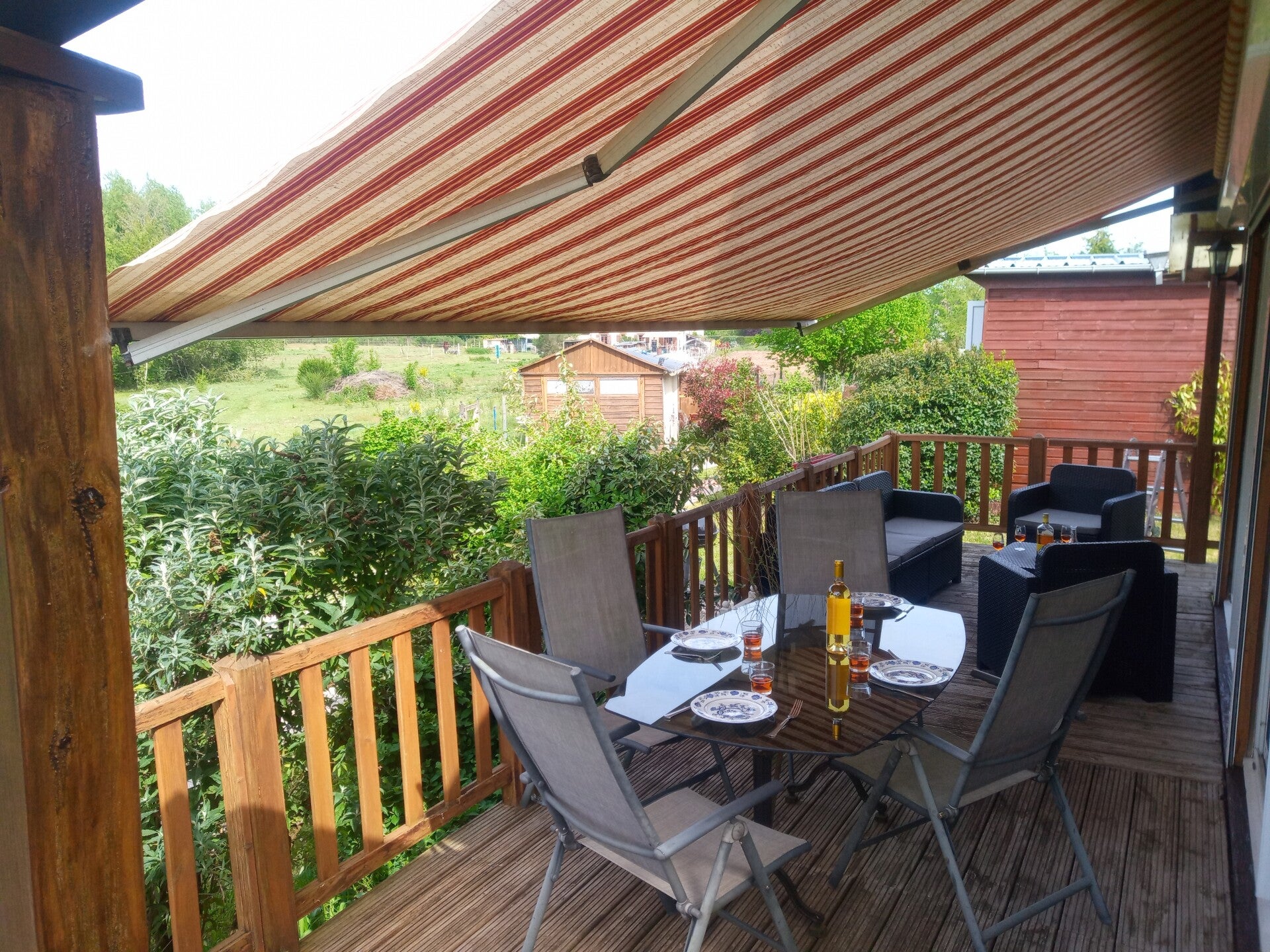 La grande terrasse en bois, orientée plein Ouest, invite au farniente et aux repas en plein air face à la nature.