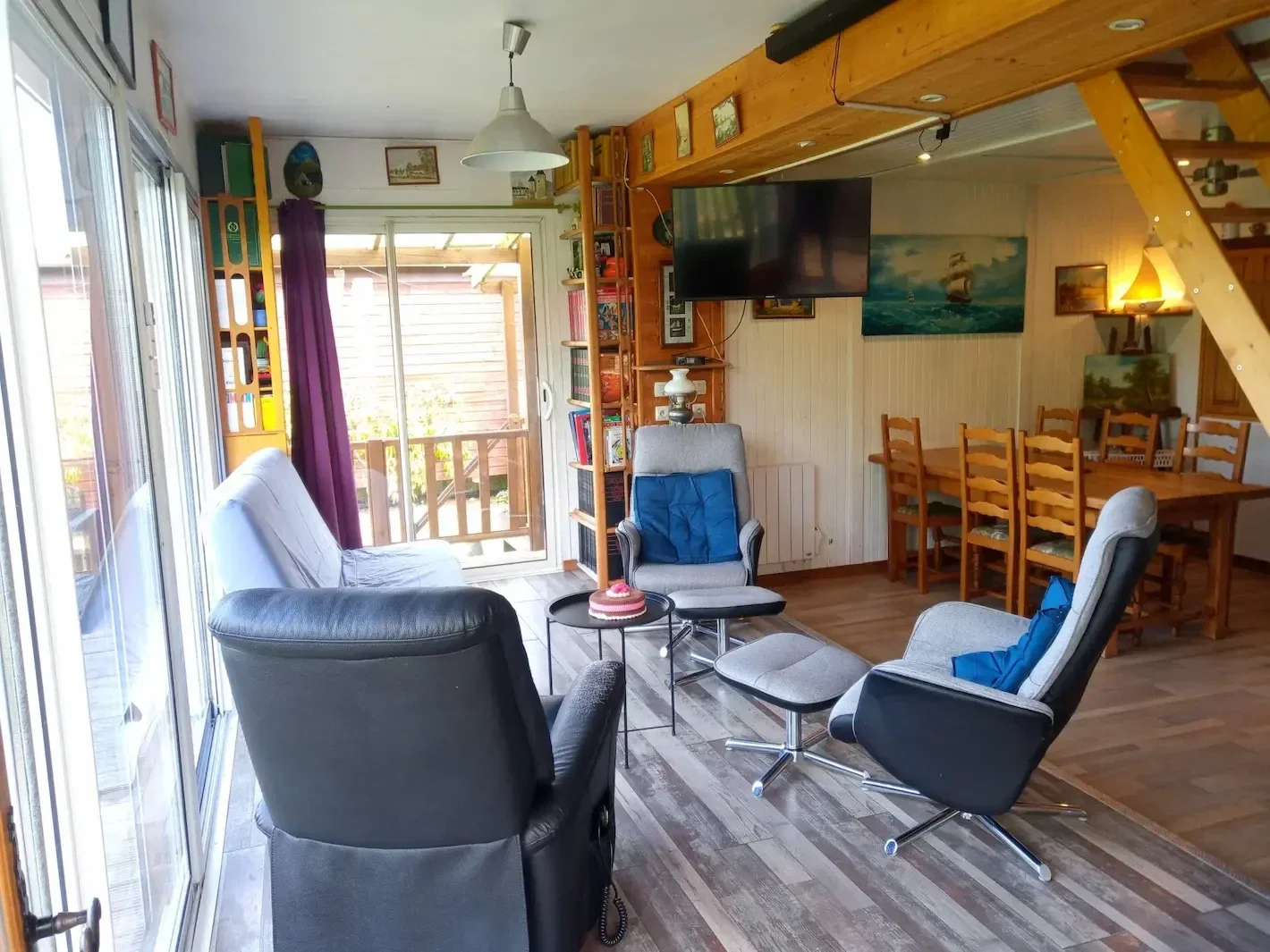 Le rez‑de‑chaussée comprend une chambre double, une pièce à vivre conviviale avec coin salon et canapé‑lit, une cuisine équipée ouverte, ainsi qu’une salle d’eau fonctionnelle.